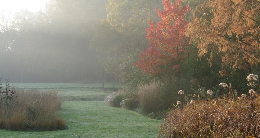 Recent hebben we de Deschampsia-grassen vervangen door Molinia of Pijpestrootje. Hier nog met "wijlen onze paardenkastanje".