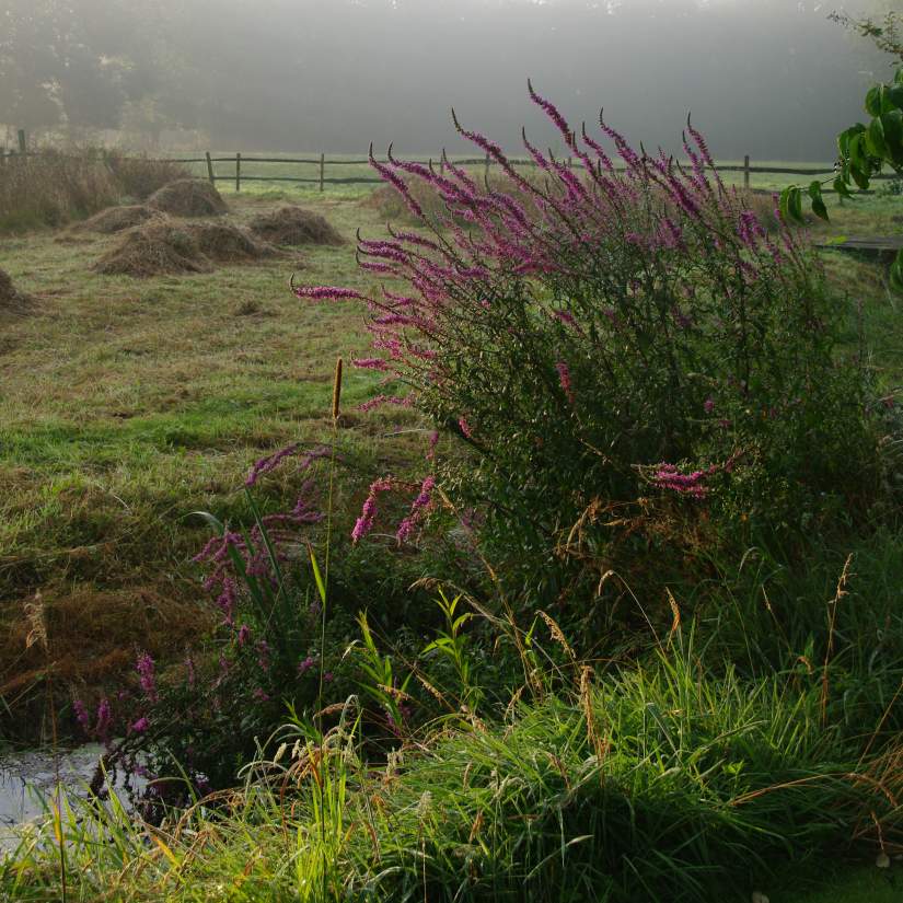 De bloemenweide na de maaibeurt, meestal is dit tegen half juli. In de ha-ha-gracht staan er nog wat kattestaarten (Lythrum salicaria). In Amerika is dit een invasieve exoot!